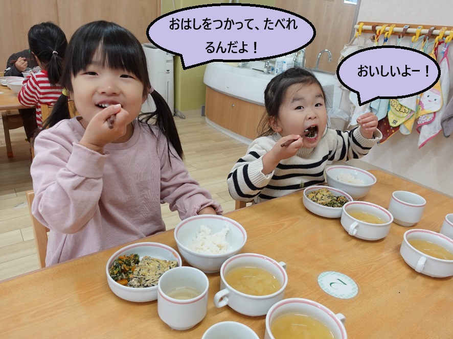 持ち方を確認し、上手につかめると「できた!」と更にやる気になっています。