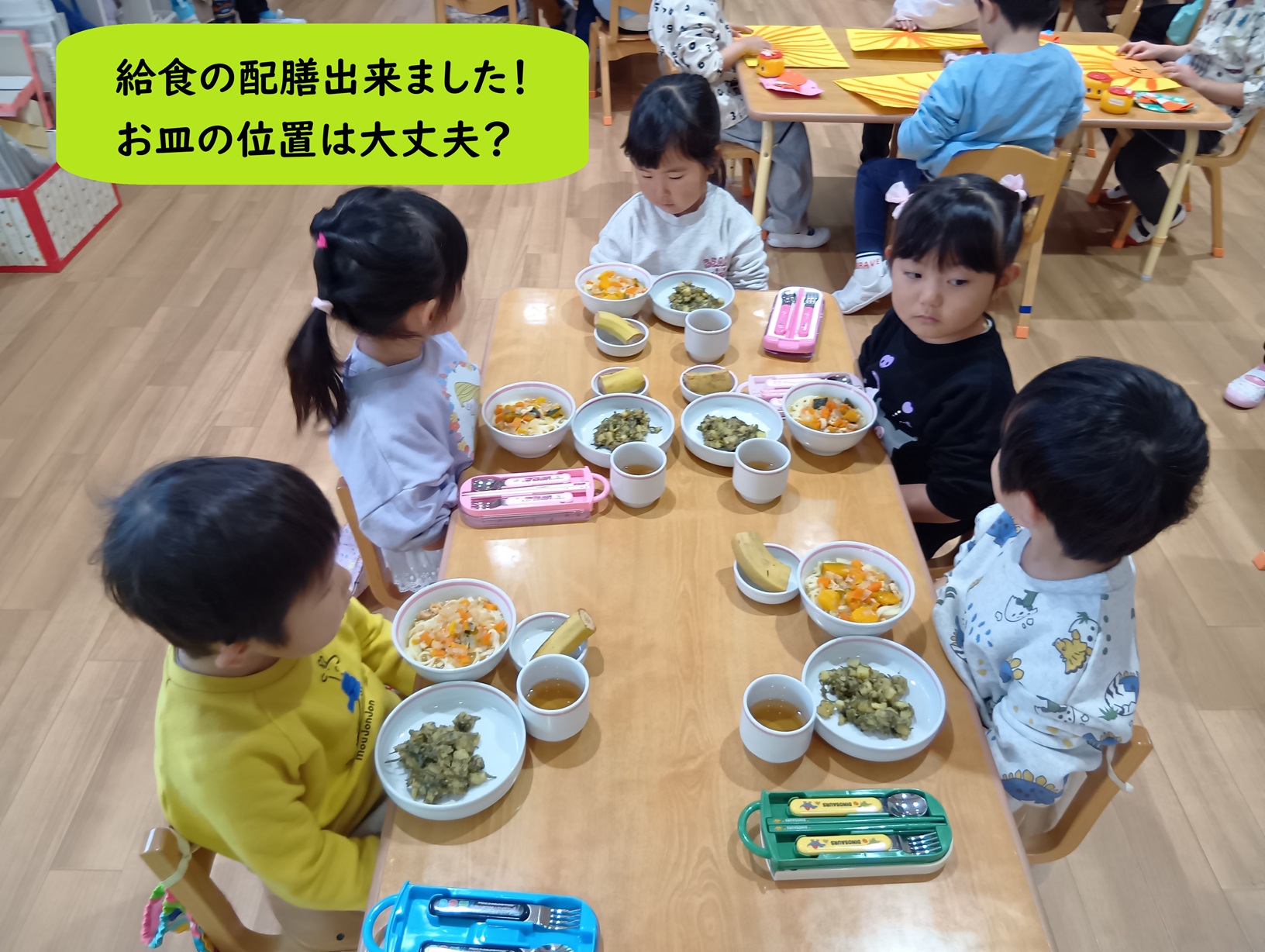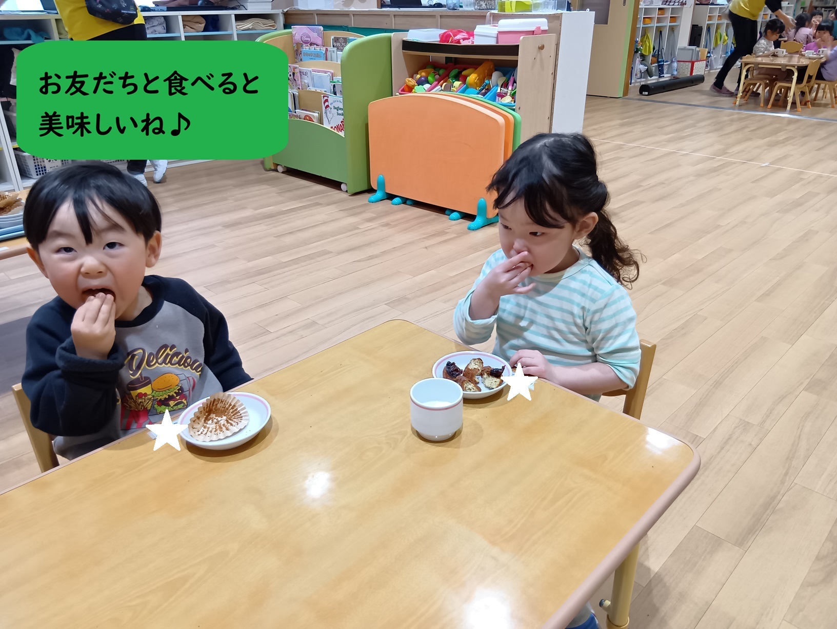 お友だちと一緒に食べる中で、「おいしいね」と目を合わせ、周りの様子を見ながら食事のマナーや関わりも学んでいます🥰