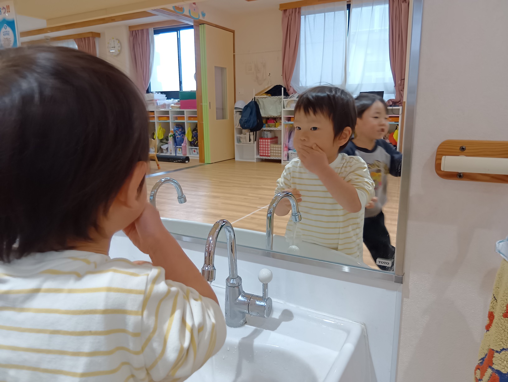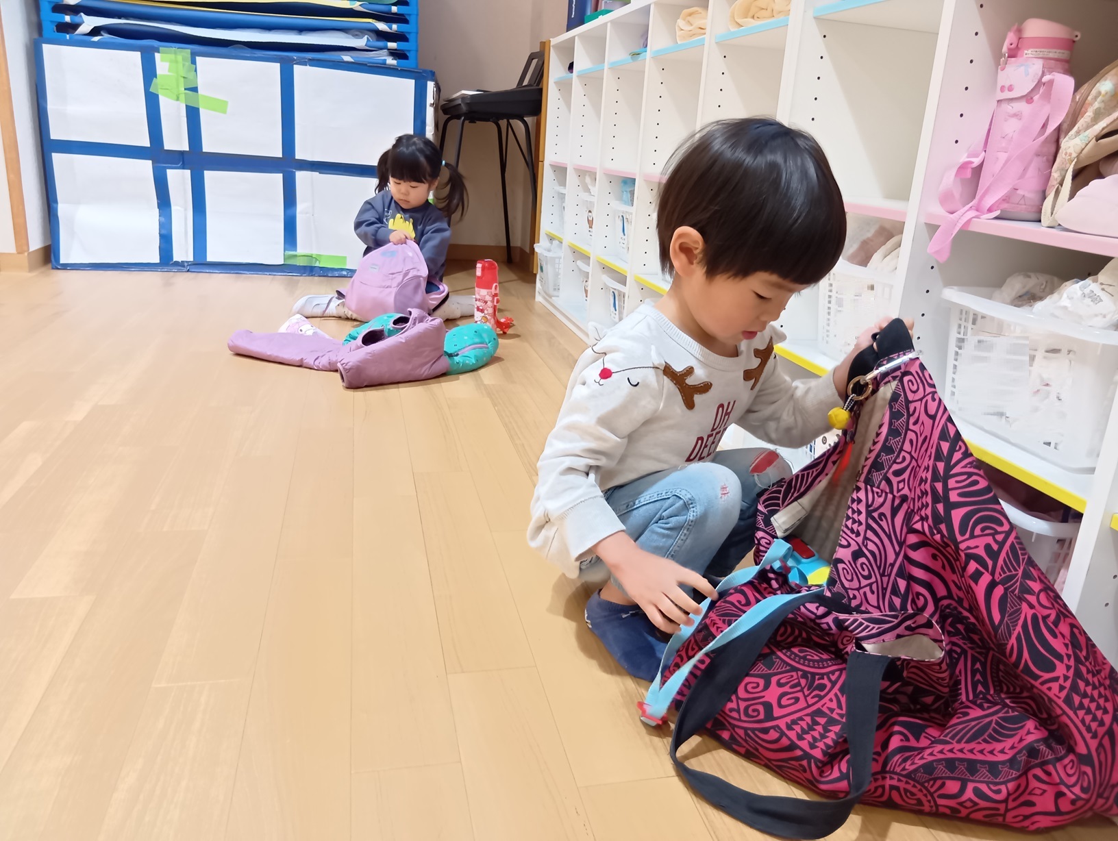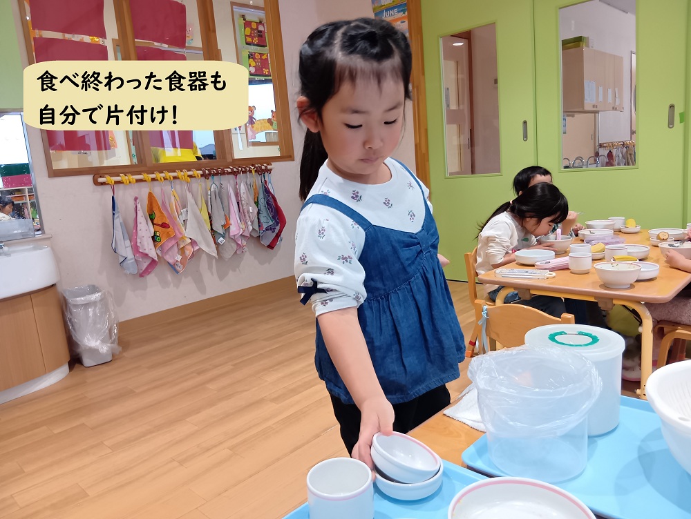 食器や靴下など「ここかな?」と考え、お友だちと一緒に片付けたりしながら、使った物を戻す習慣も身についてきました。