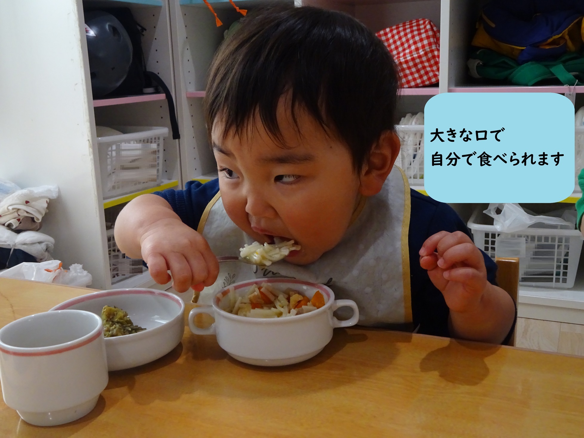 おやつや給食の時間には、スプーンを持って自分で口へ運ぶ姿がたくさん見られました。
