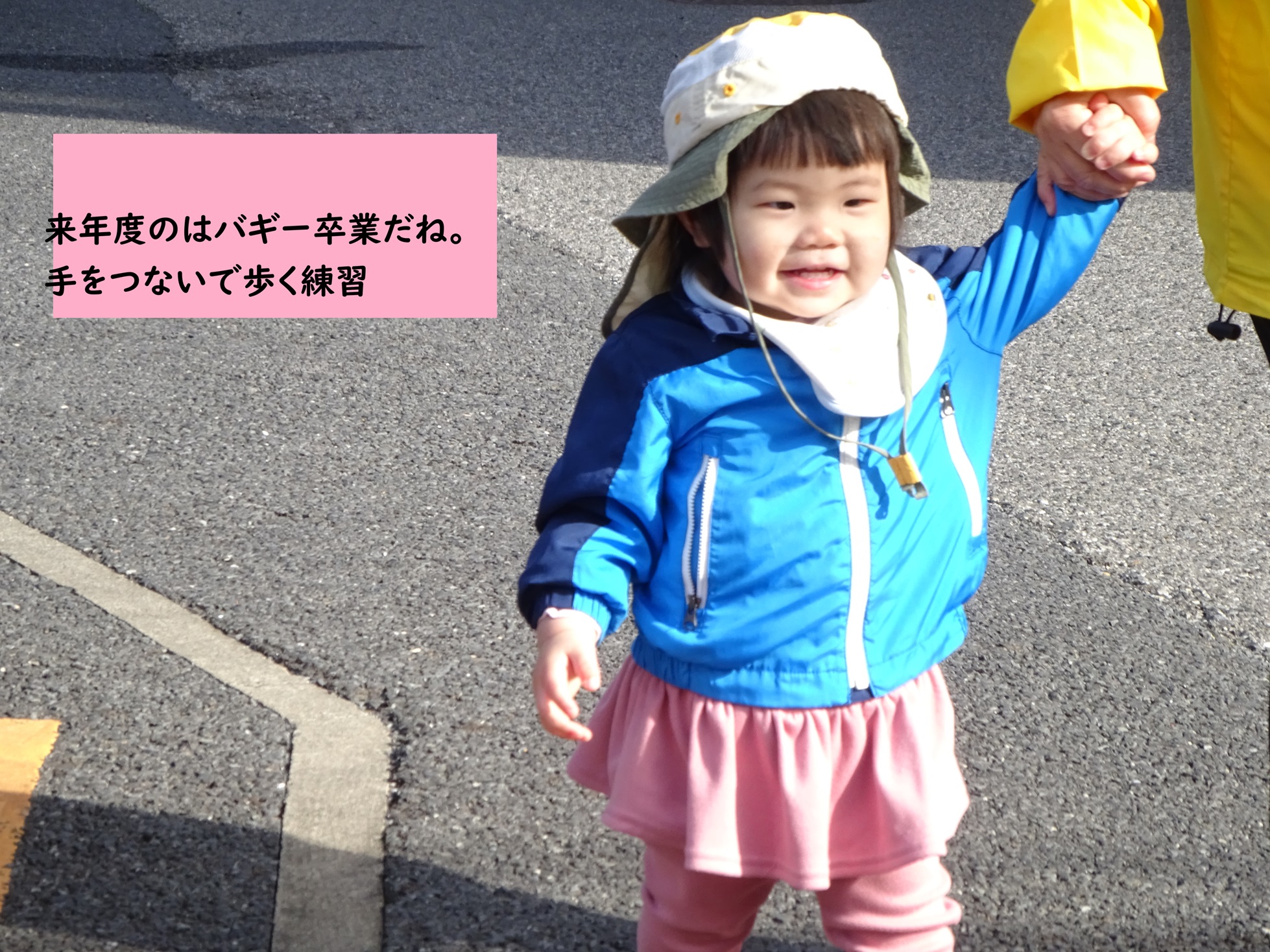 帽子をかぶったり、大人の手をぎゅっと握って歩いたり…一歩一歩、
