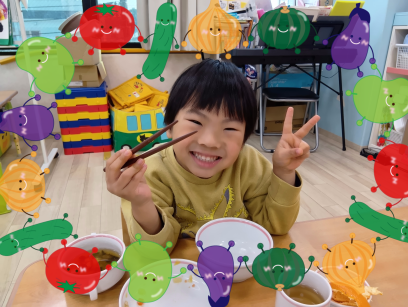 はじめは難しそうにする姿がありましたが「つかめるようになった~」と、お箸で食事ができることでまた一つ自信がついた子どもたちです😊