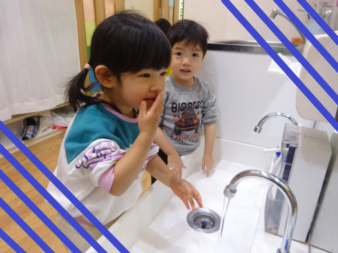進級に向けて、朝のおやつの後は手と口を洗いにいきます。
