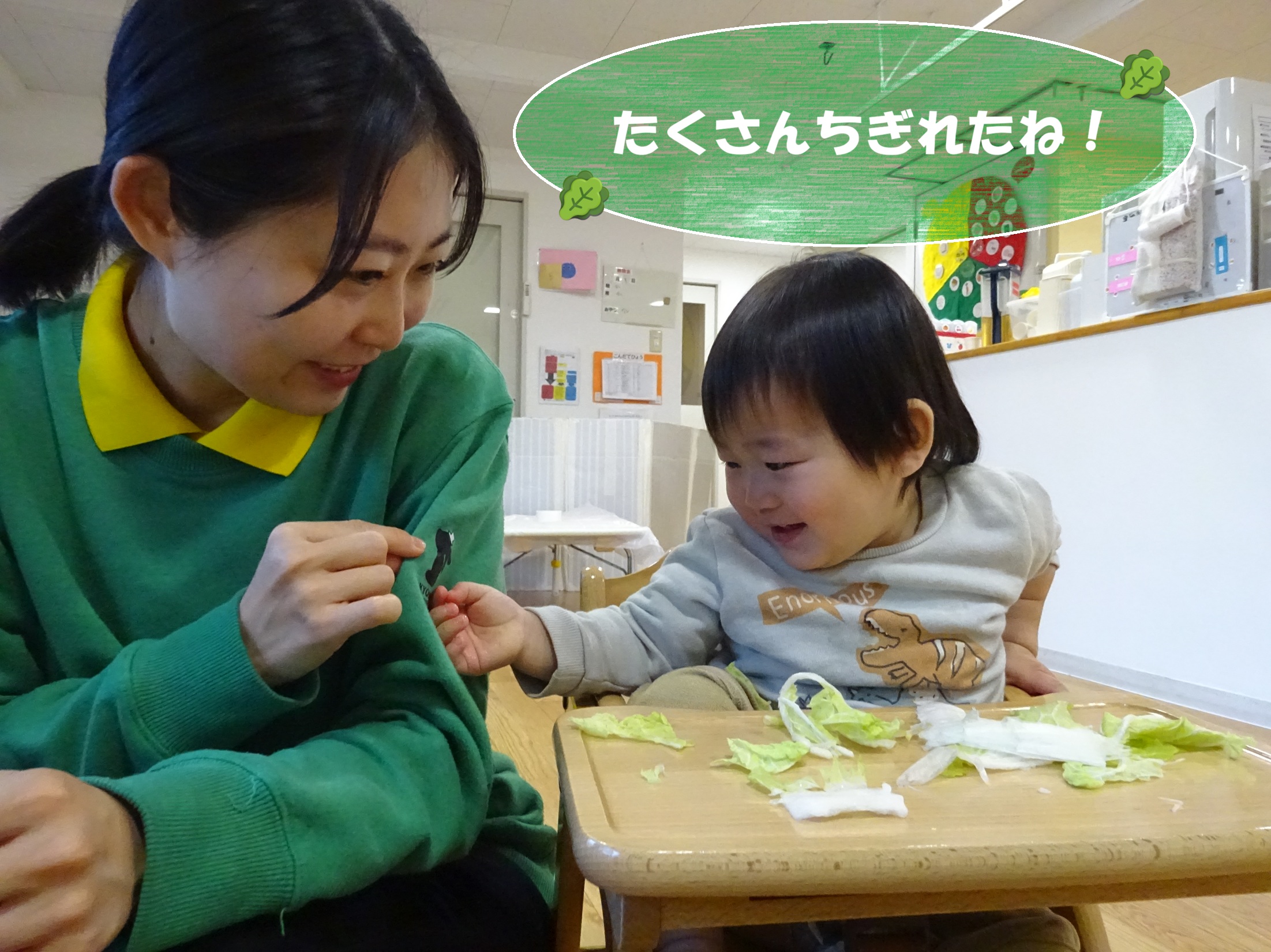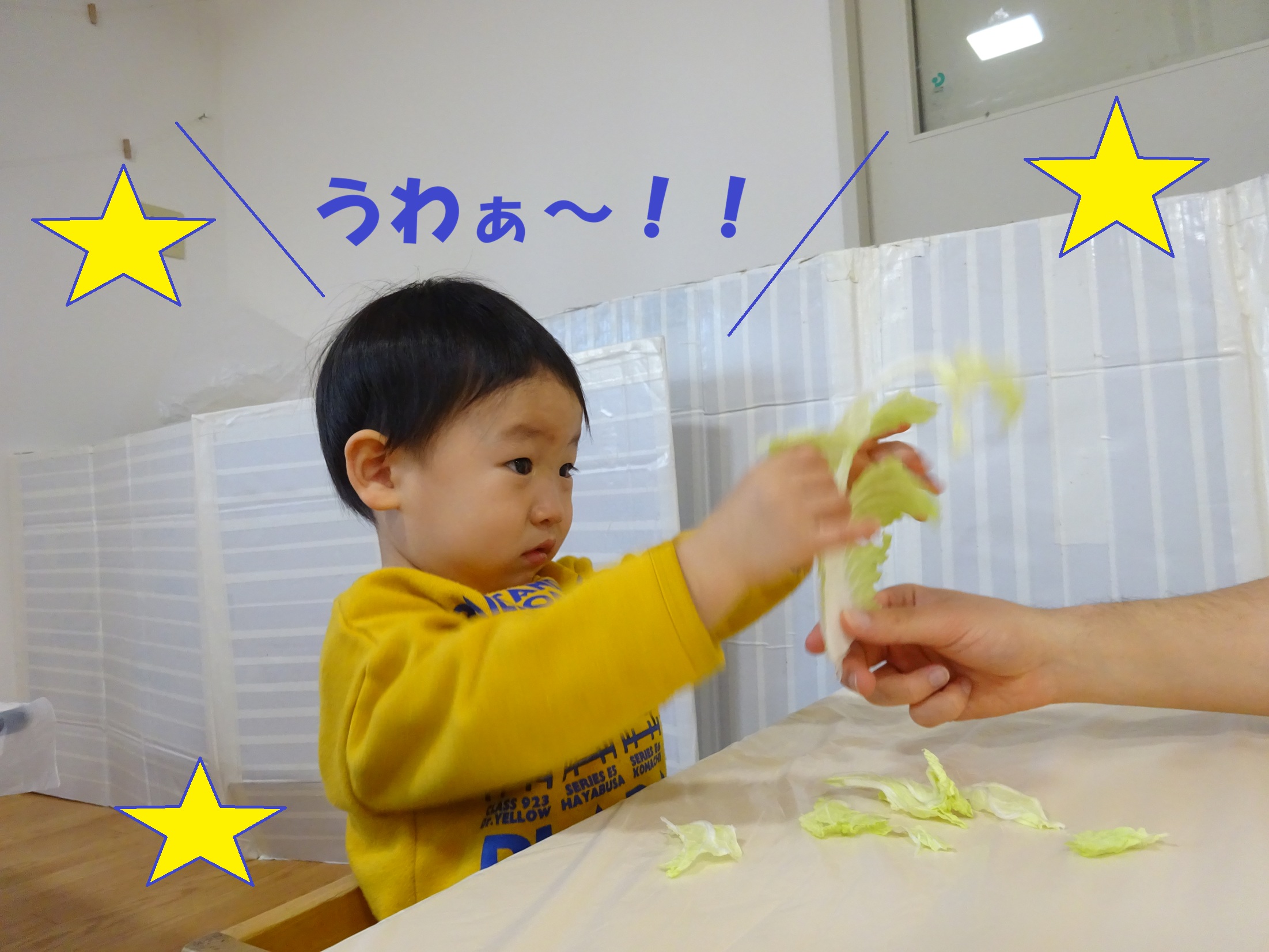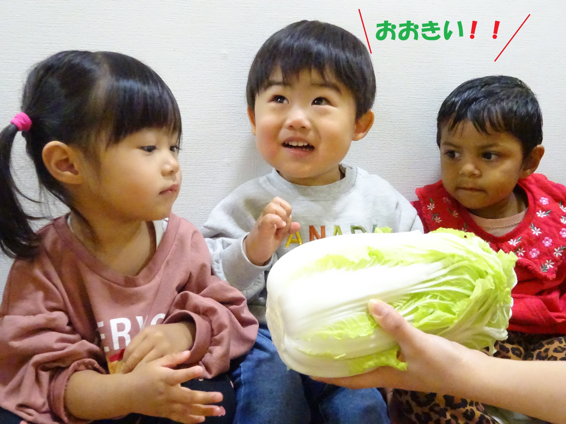 実際の白菜を見て、触れて、嗅いで五感で楽しむ子どもたちです🤗