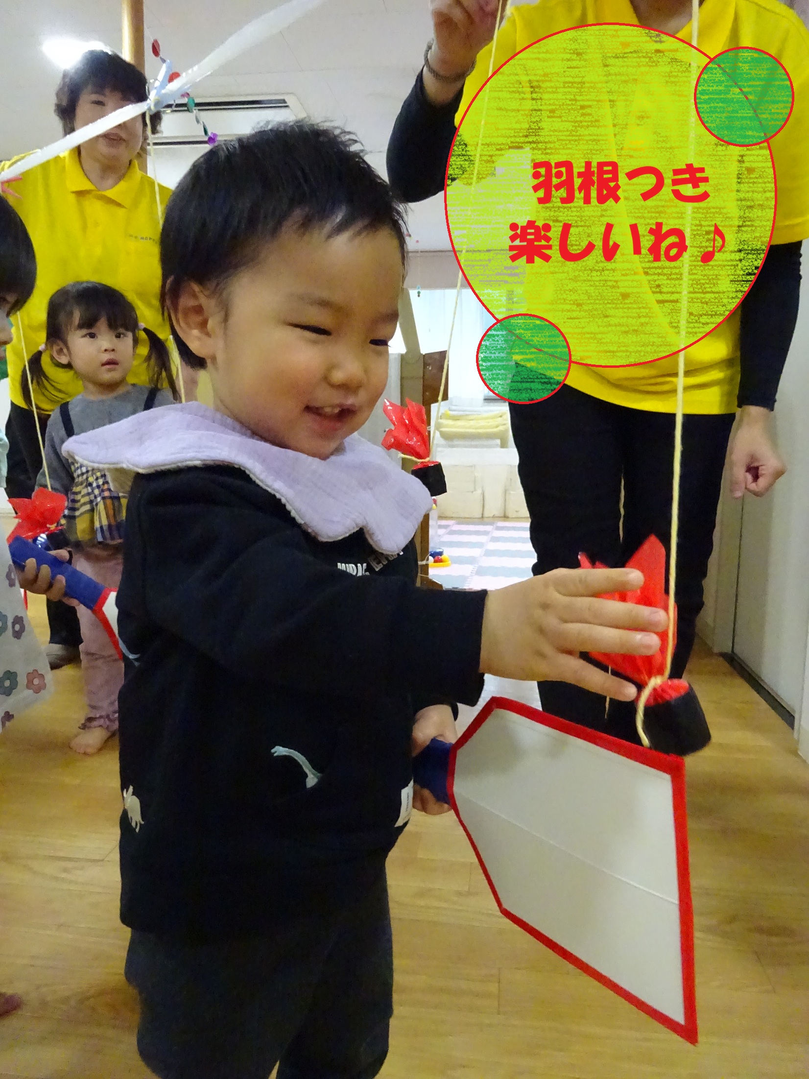 本物のコマに触れたり、手作りコマを作ったり、羽根つき、凧揚げと新年早々元気に正月遊びを楽しみました!