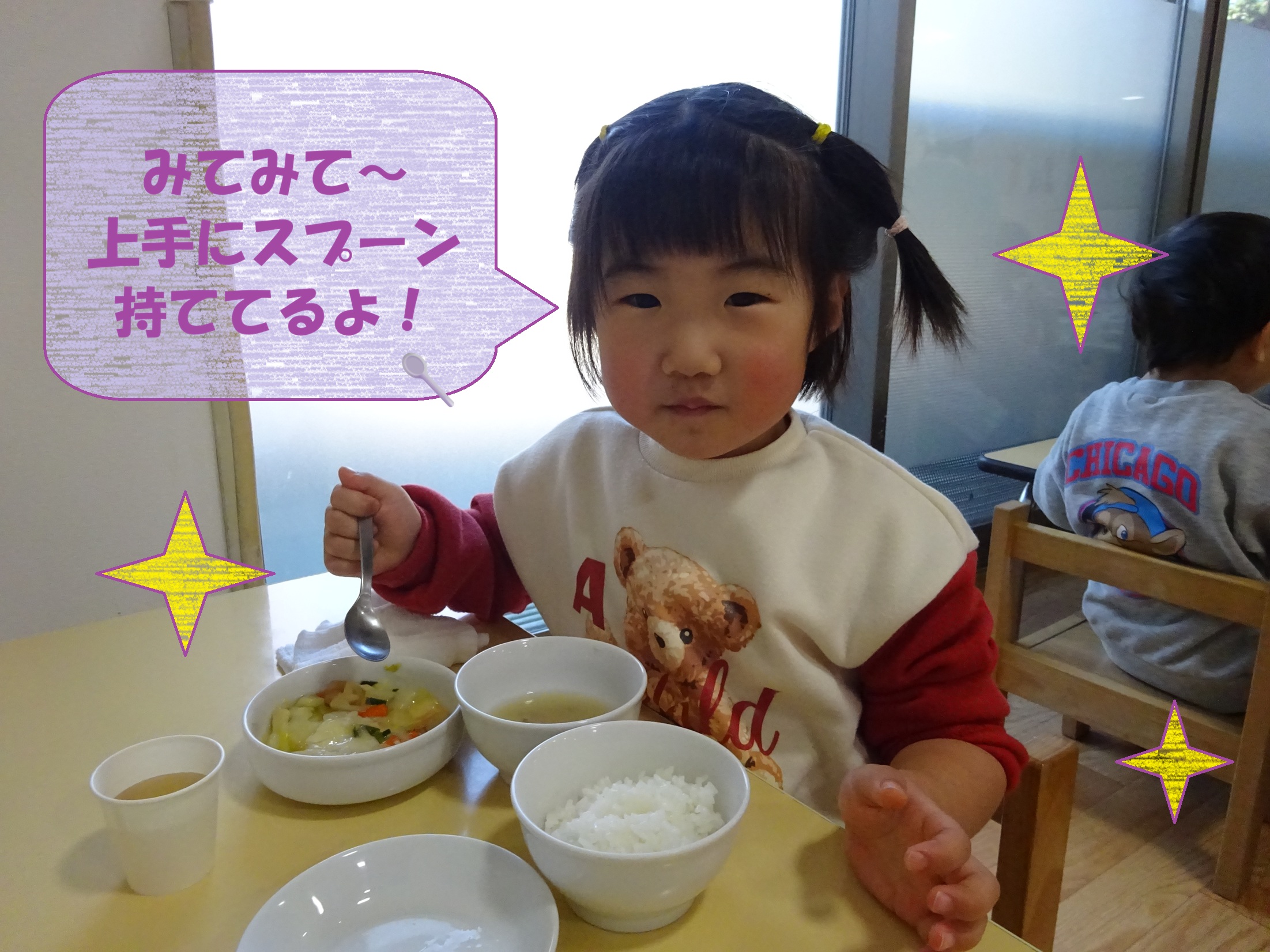 2歳児クラス(シリウス組)ではスプーンから箸への移行ができるように食具の持ち方も逆手持ちで持てるように伝えています。