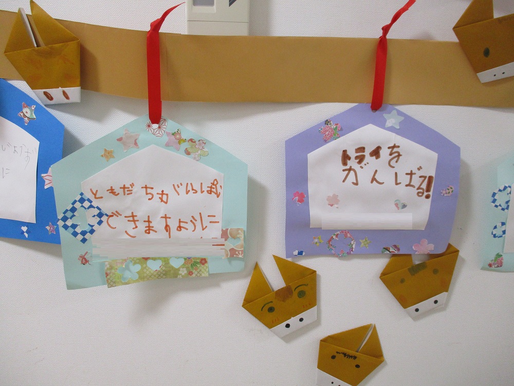 もうすぐ小学生になるシリウス組(5歳児)のお友だちはそれぞれ進学する小学校に期待を膨らませ、絵馬に決意や願い事をしたためていました。