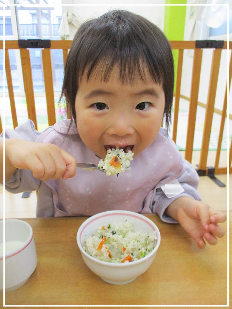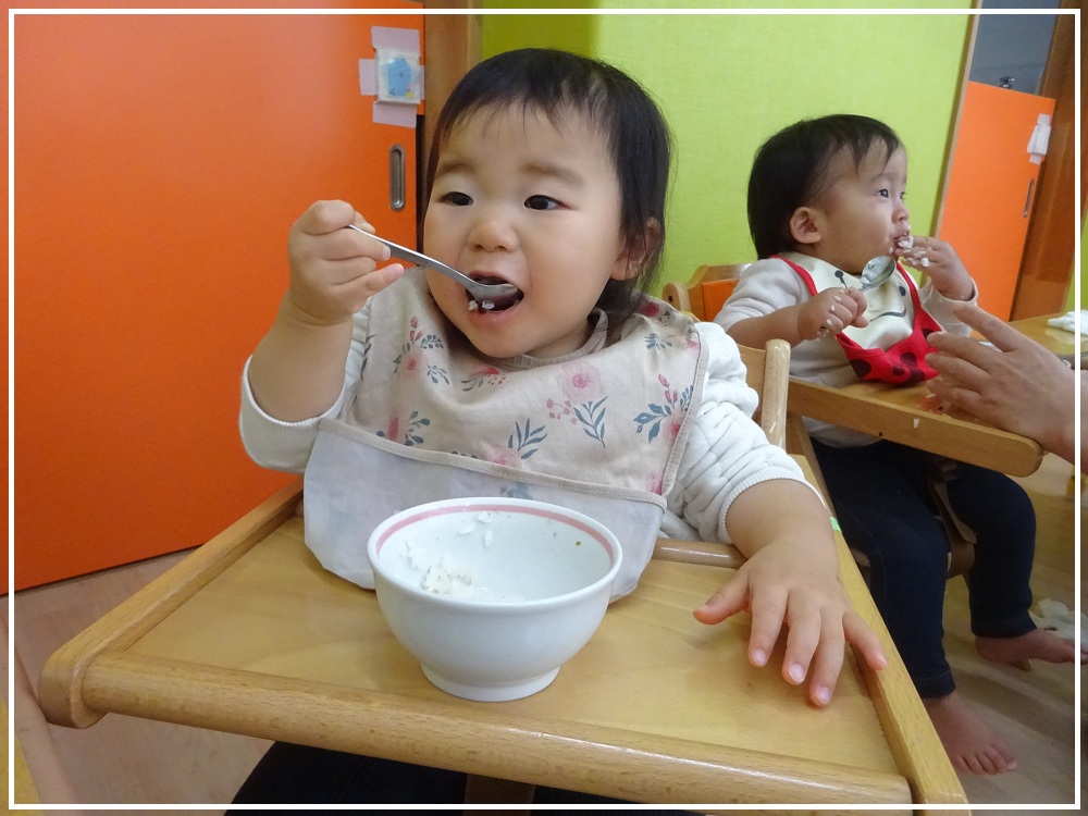 スピカ組(1歳児)のお友だちは、給食やおやつで上手にフォークやスプーンを使って自分で食べることができるようになりました。