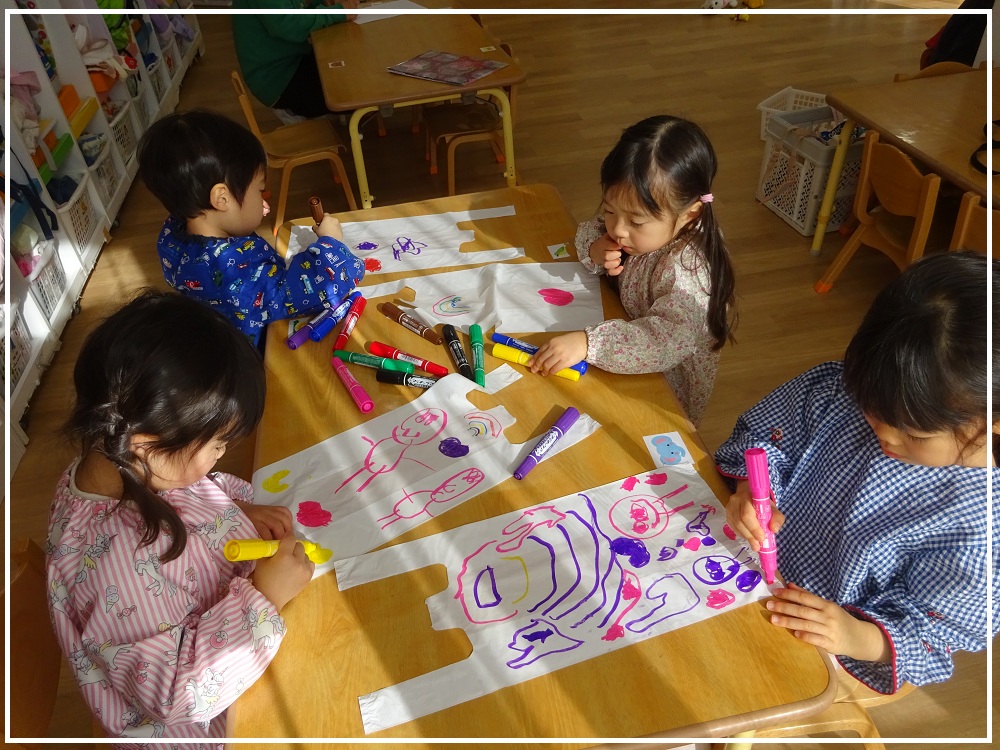 カペラ組(3歳児)では、油性ペンを使って凧作りです。