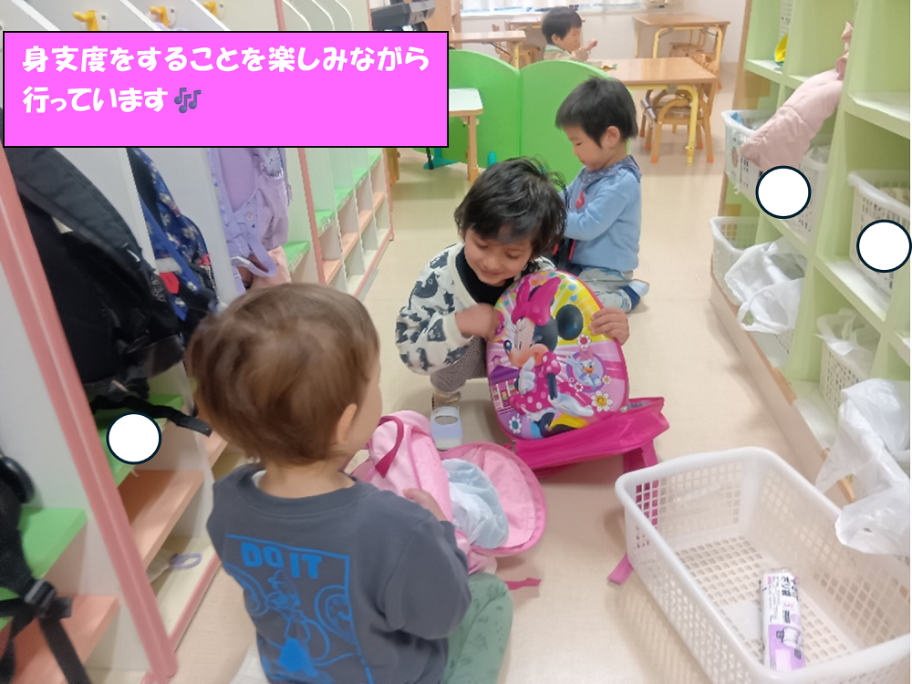 帽子や上着をかけたり、リュックに汚れ物をしまったりとお友だちや保育者と一緒に楽しんで行っています💛