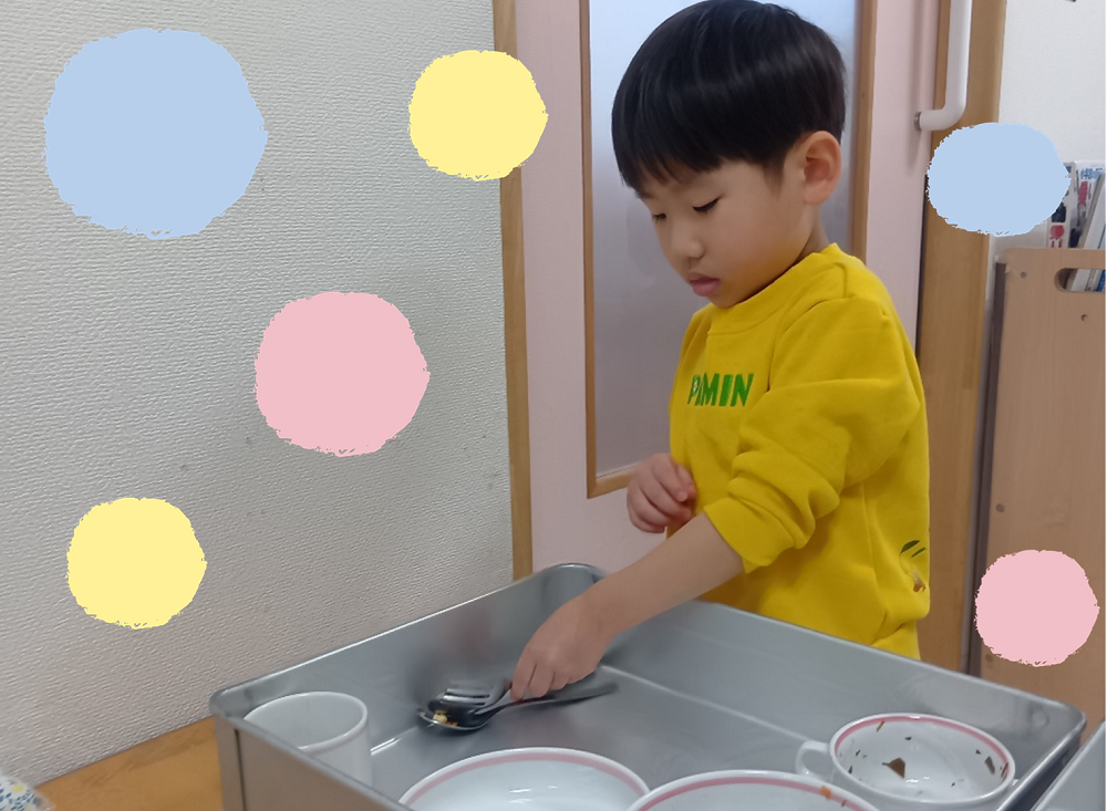 他にも幼児クラスでは、食事後の食器を自分たちで片づけを行っています。