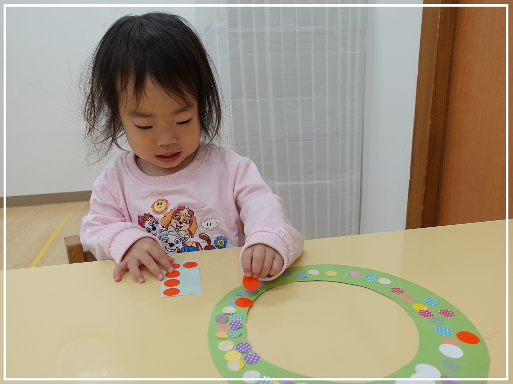 スピカさんは高月齢の子どもはシール、低月齢の子どもは花紙を使ってリースを作りました✨