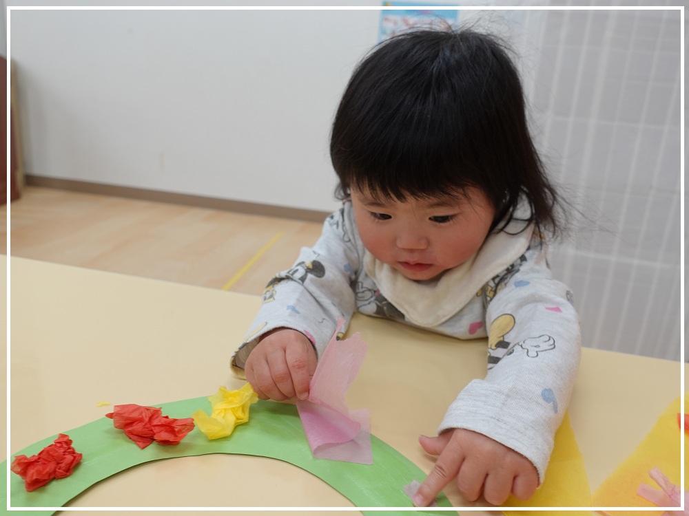 日ごろ、新聞紙をビリビリしたり、ぽっとん落しなどの指先を使った遊びをしたりした成果が出ており、シールを台紙からはがして貼る、花紙をちぎるなど、以前よりもスムーズにできるようになっていました。