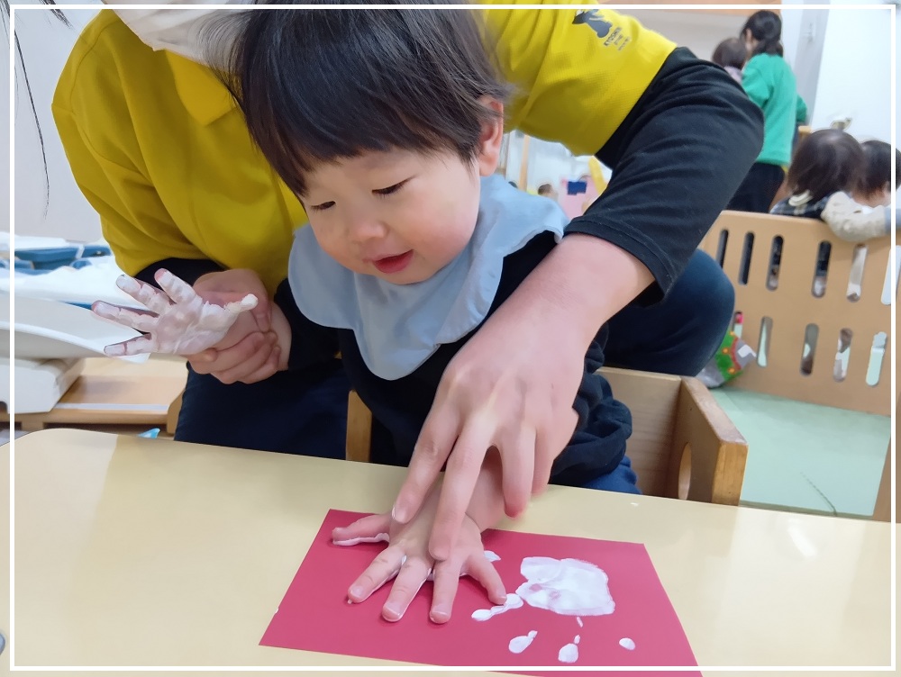 自分から保育者に手を広げて見せてくれ、紙に押す時には上手に力を込めてくれています!