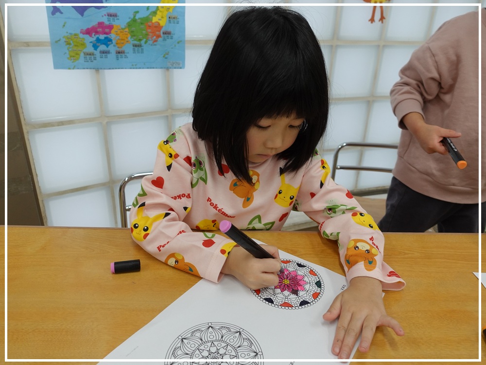 窓はステンドグラスのような曼荼羅塗り絵を貼りました✨