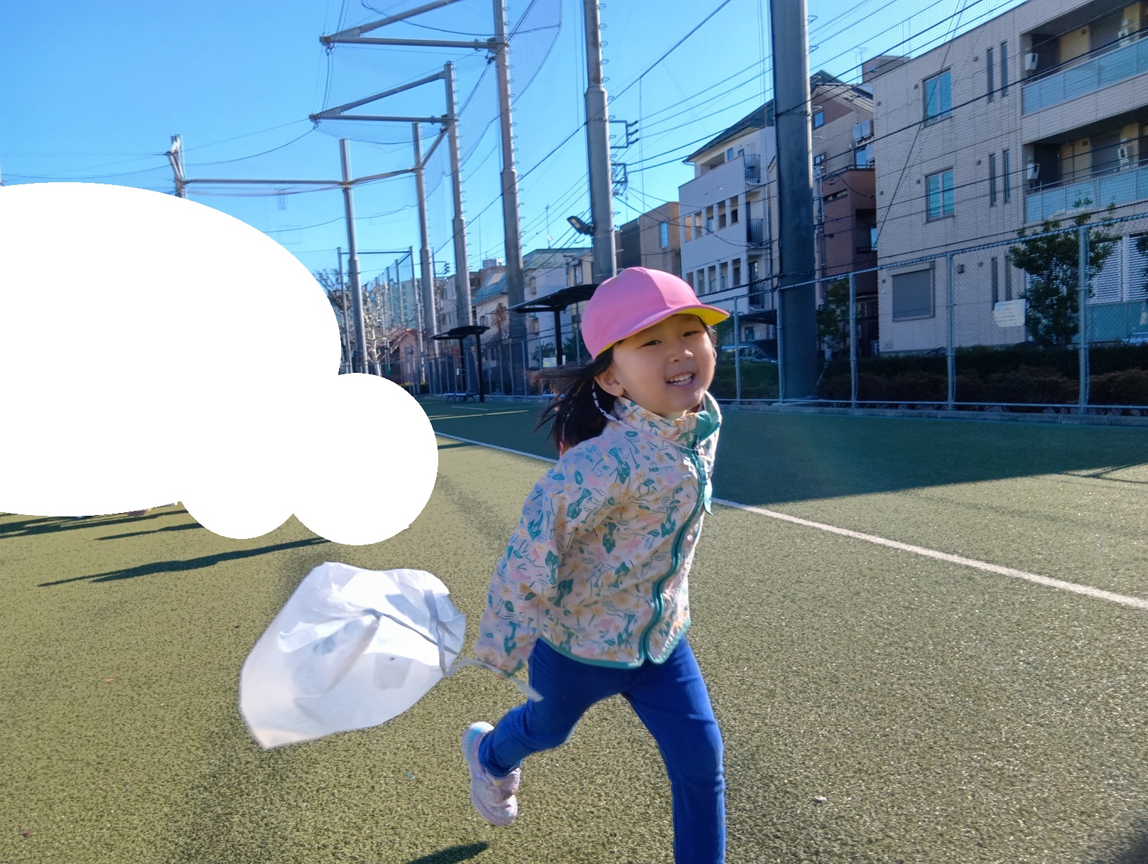 散歩先の公園に行って特製凧あげであそびました。
