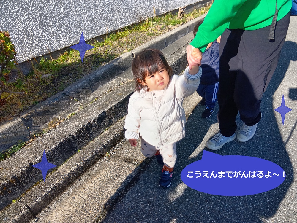 公園に着くまでにたくさんの乗り物が通るなど気になるものがあっても手を最後まで離さず歩くことができます!