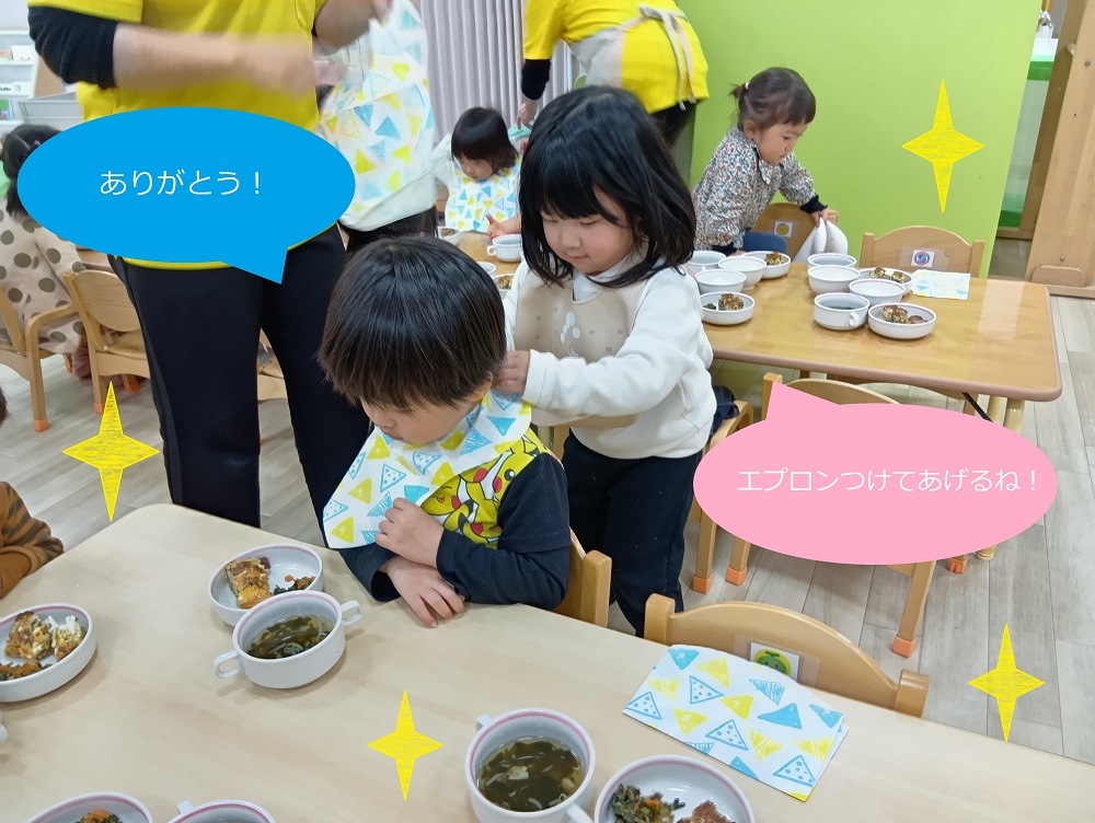 先生につけてもらっていたエプロンを自分で付けるようになり、お友だちが困っていると付けてあげる姿が見られます!