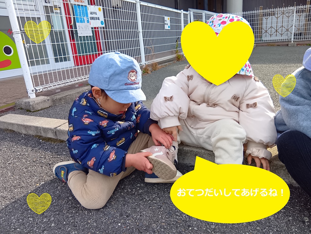 お友だちの靴が脱げたときはお手伝いして履かせてあげます!