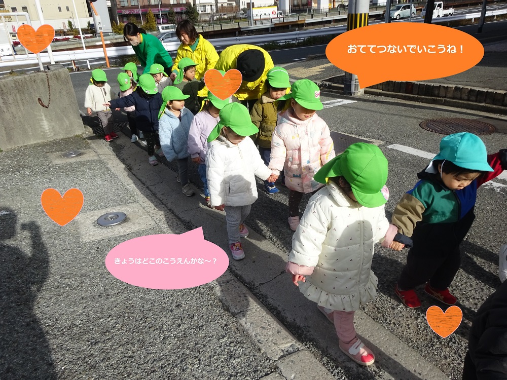 シリウス組(2歳児)は、子どもたちだけで手を繋いで歩いています!