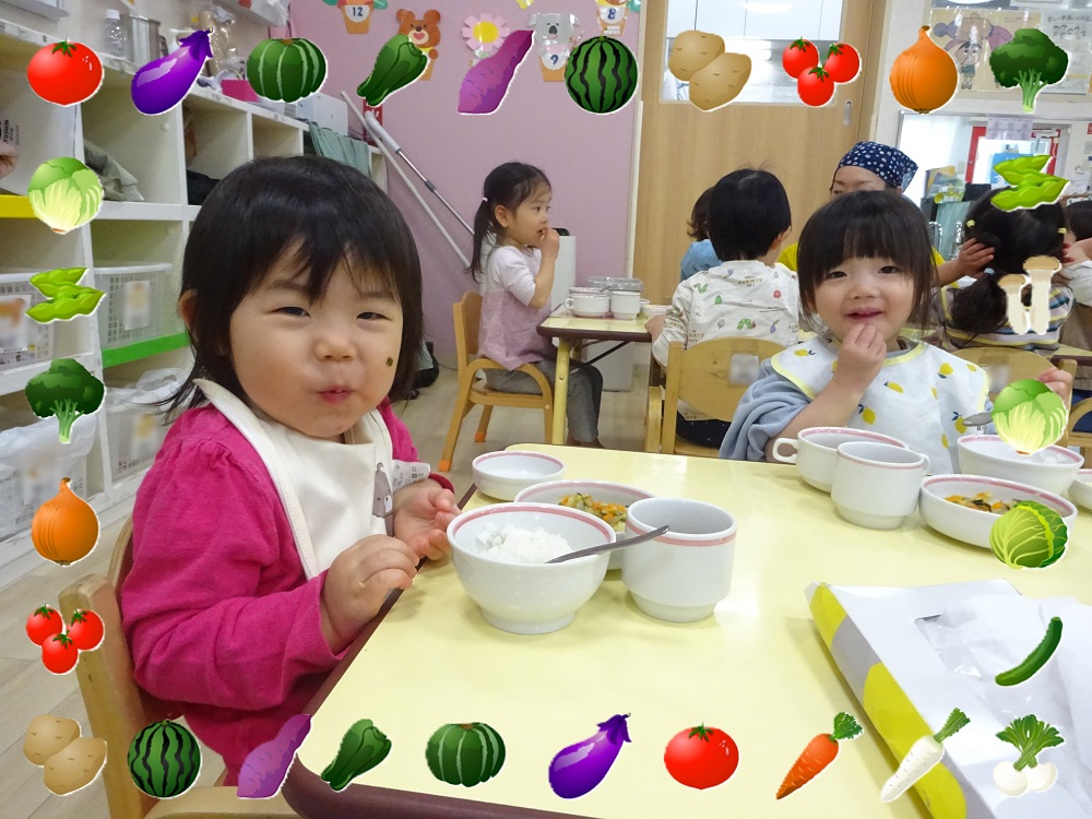 ベガクラス(1歳児)では食具を使用して食べる経験を通して、食べたい意欲を育てられるようにしています。とても楽しそうですね♬
