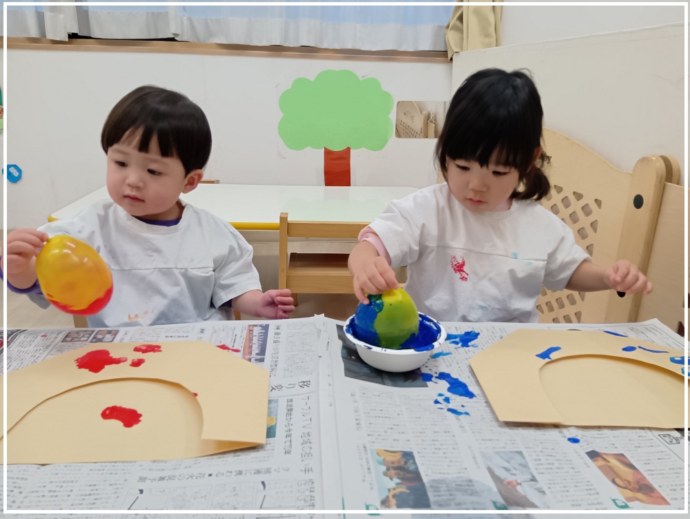 「青鬼がいい!赤鬼がいい!」と選んで風船で色をつけを楽しむ子どもたち。