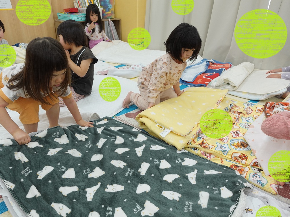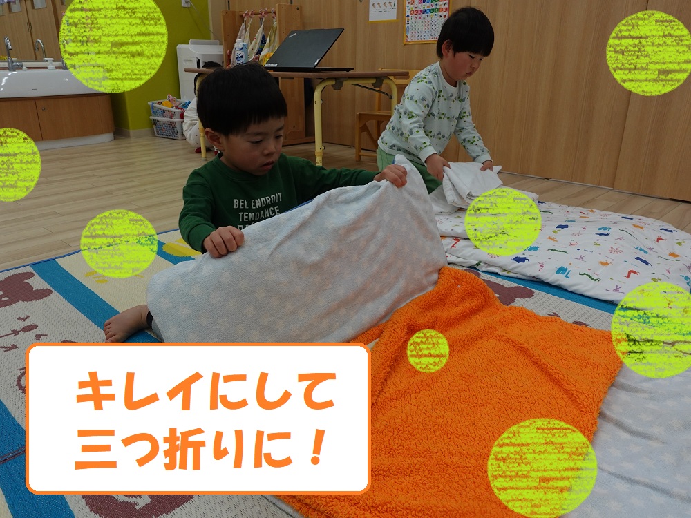 初めの頃はお布団を三つ折りにするのが難しく、「できない~」と言っていた子どもたちも、今では起きると掛け布団まですんなりまとめて三つ折りにし、金曜日には布団袋の中にまで仕舞ってくれていますよ🎵