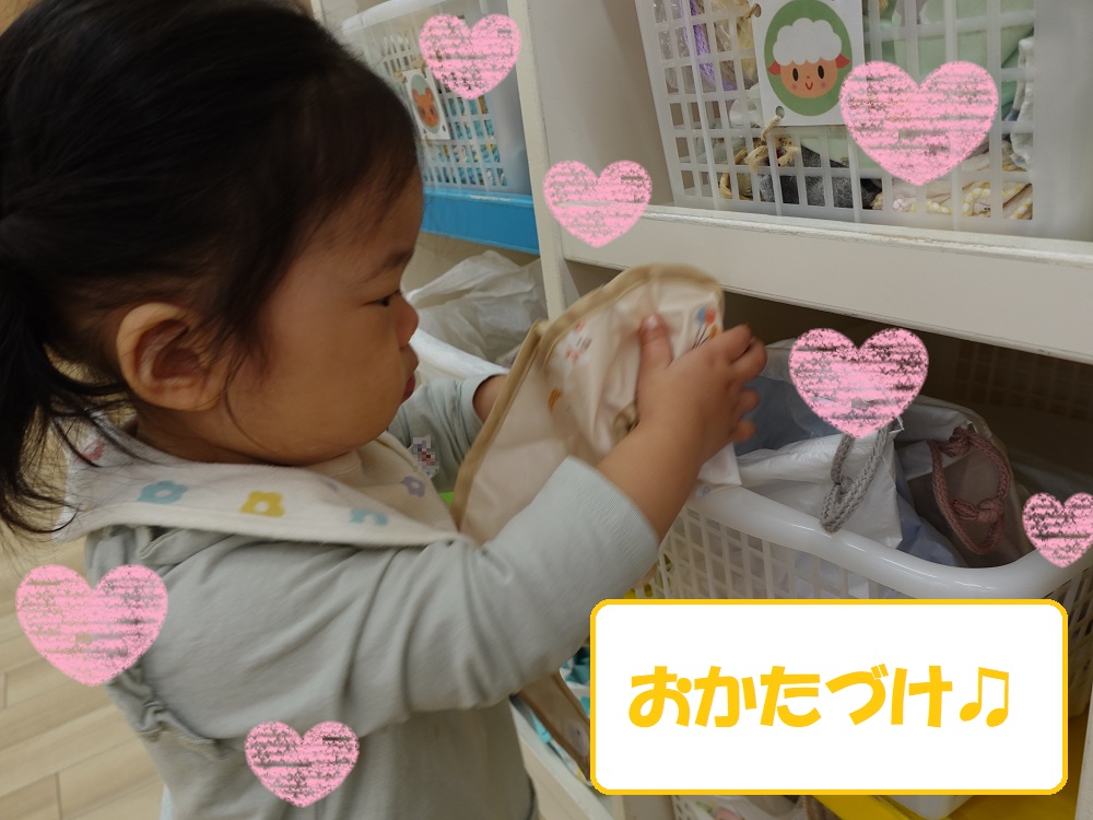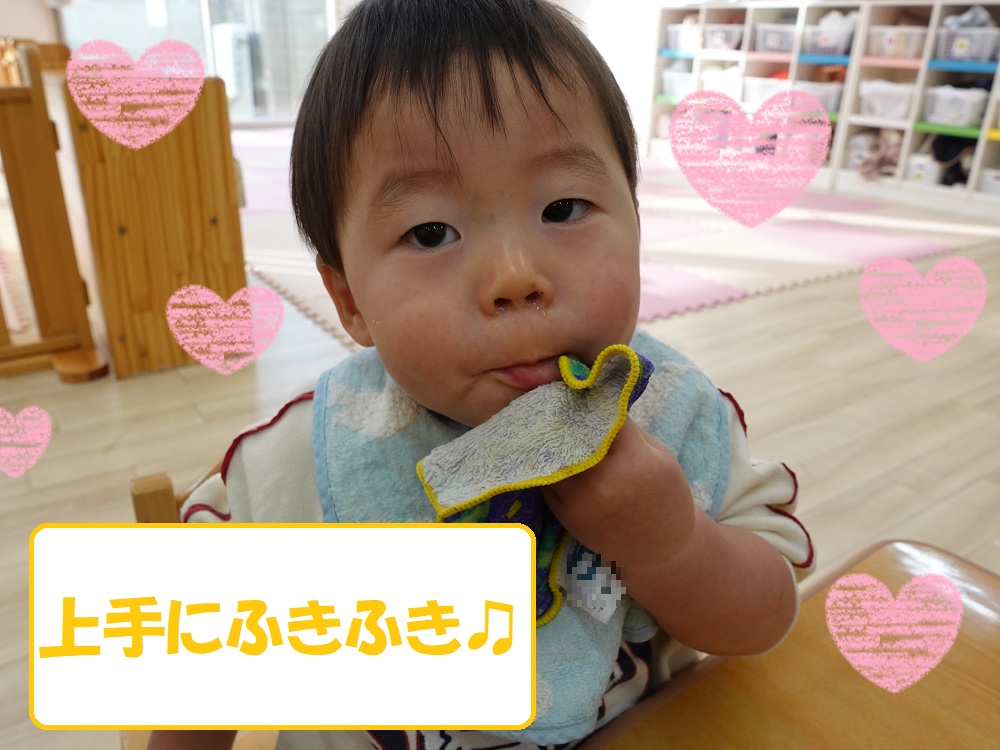 今までは先生と一緒に行っていましたが、最近では、一人でお片付けに行ったり、「お口拭いてね」と声を掛けると自分自身で拭いたりする姿が見られるようになりました!😊