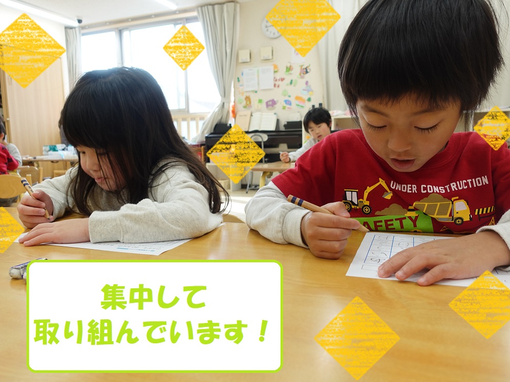 シリウス組(5歳児)への進級に向けて、1月より午睡の時間を短縮し、おやつの時間までの間にプリント学習に取り組んでいます。
