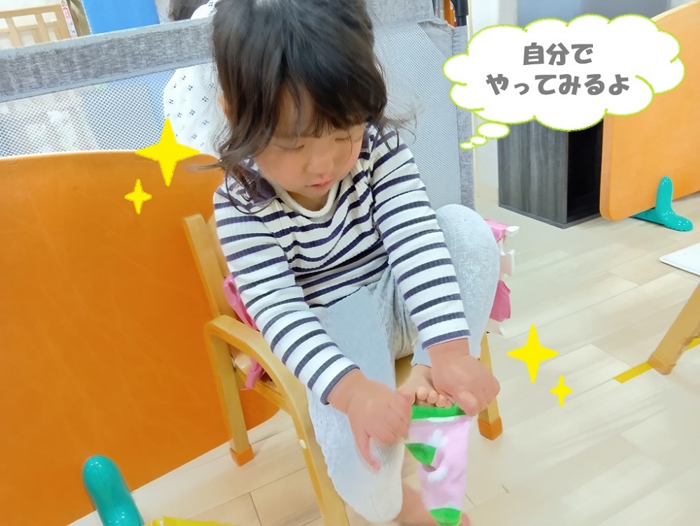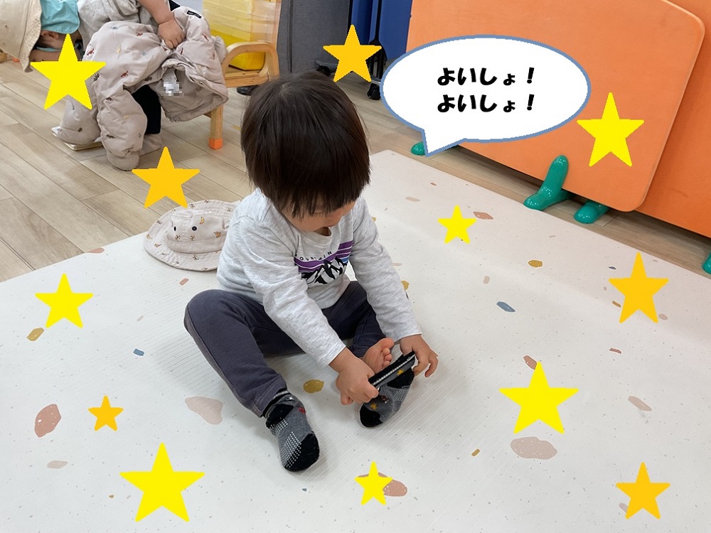 難しいところは保育者の援助も必要ですが、靴下を足に入れようとしたり、靴下を引っ張って最後まで履こうと一生懸命です。