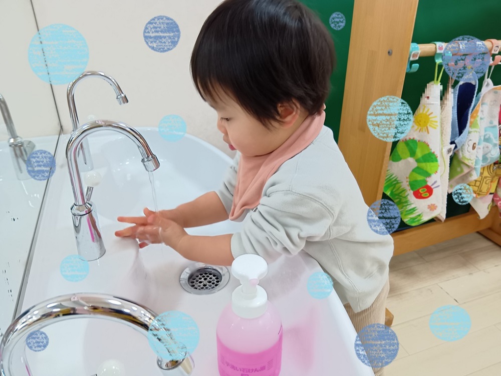 自分が石鹸を使い終わると、隣にいるお友だちや保育者に「石鹸どうぞ!」と渡してあげる姿も見られ、とても優しい子どもたちです!
