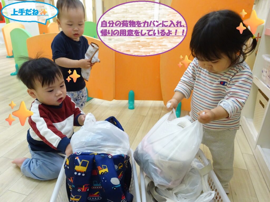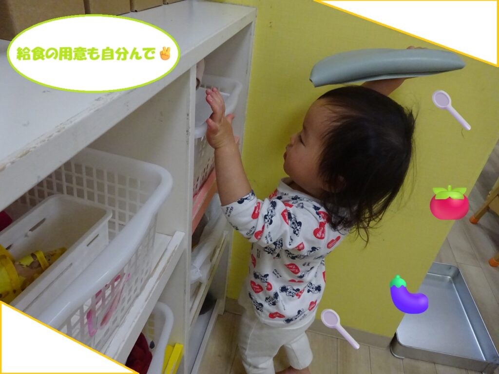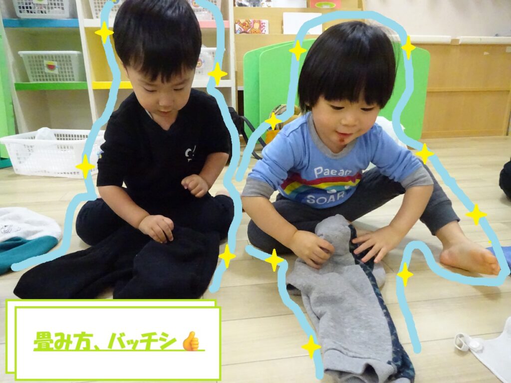 2歳児さんになると自分で身の回りのことを行う機会が増えていきます。少しずつベガ組さんも自分のことを自分で行っていますよ!