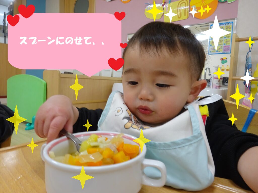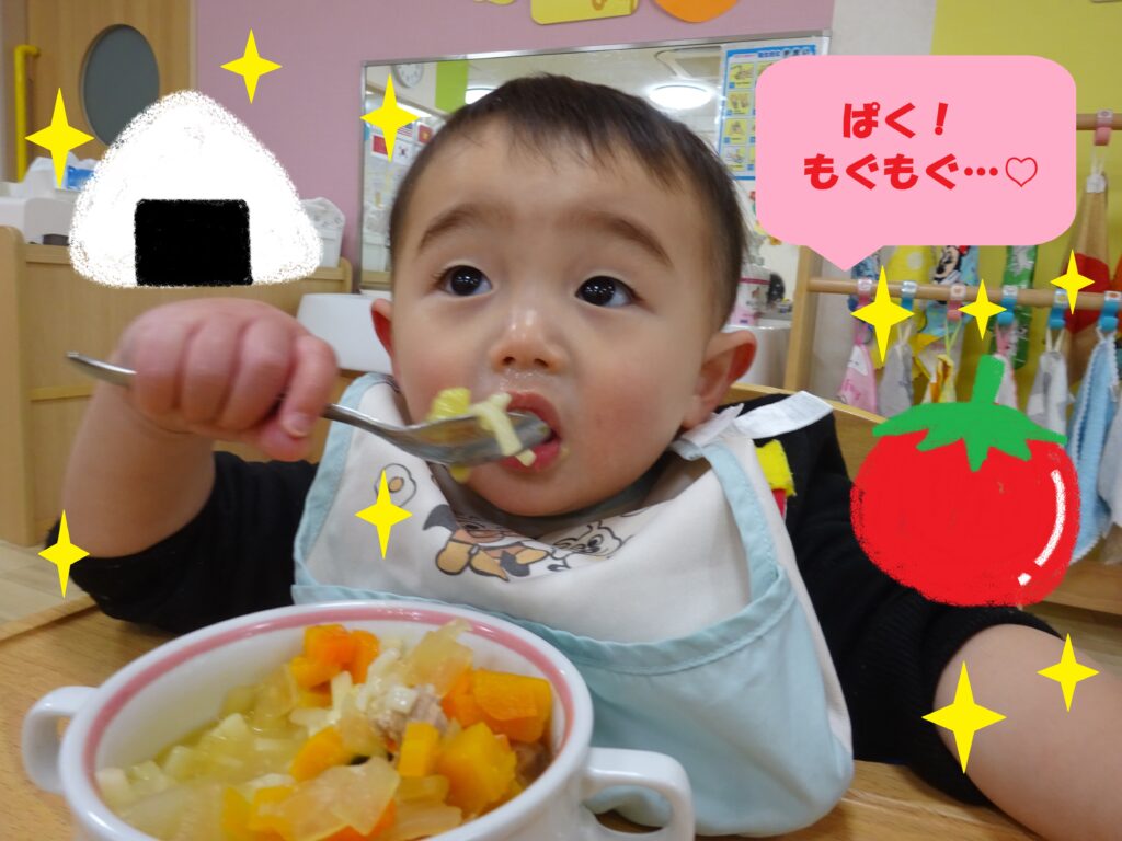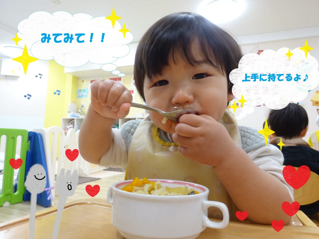 初めはうまく持てなかったり、手づかみで食べたりすることもありましたが、スプーンを握る練習から始め、保育士と一緒に持って食べたりできるようになりました✨
