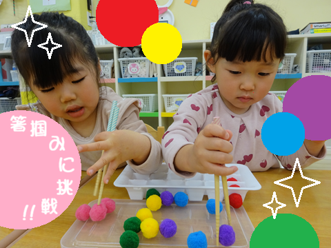 今は箸を使うために遊びの中で箸を使ってボールを掴む練習をしています!
