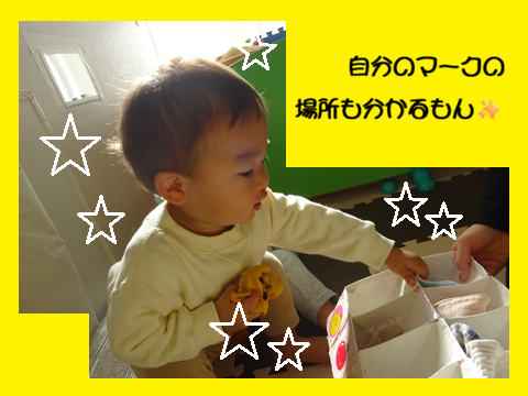 次のクラスに向けて年上組はカゴにおしぼりなどを片付けれるようになった他、公園に行く準備の際に自分のマークから靴下や帽子を取れるようになりました✨