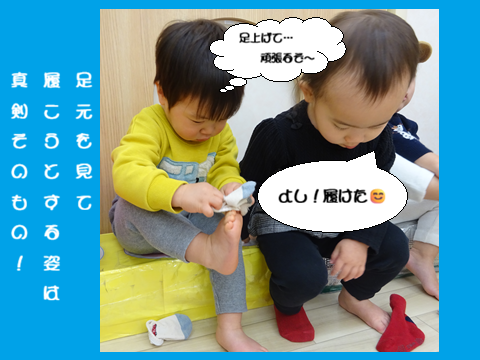 靴下は右足側は履けるようになっていますが、左足側に苦戦している子どもたち💦