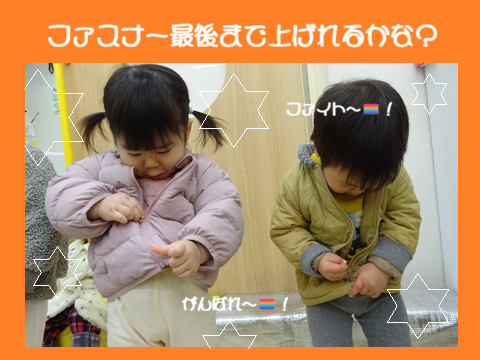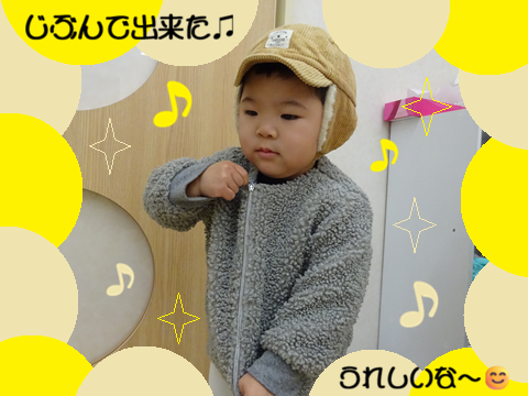 ジャンパーは最初の留める所はまだ難しいので、いつも『せんせい、てつだって』と自分の思いを伝えて手伝ってもらいます!
