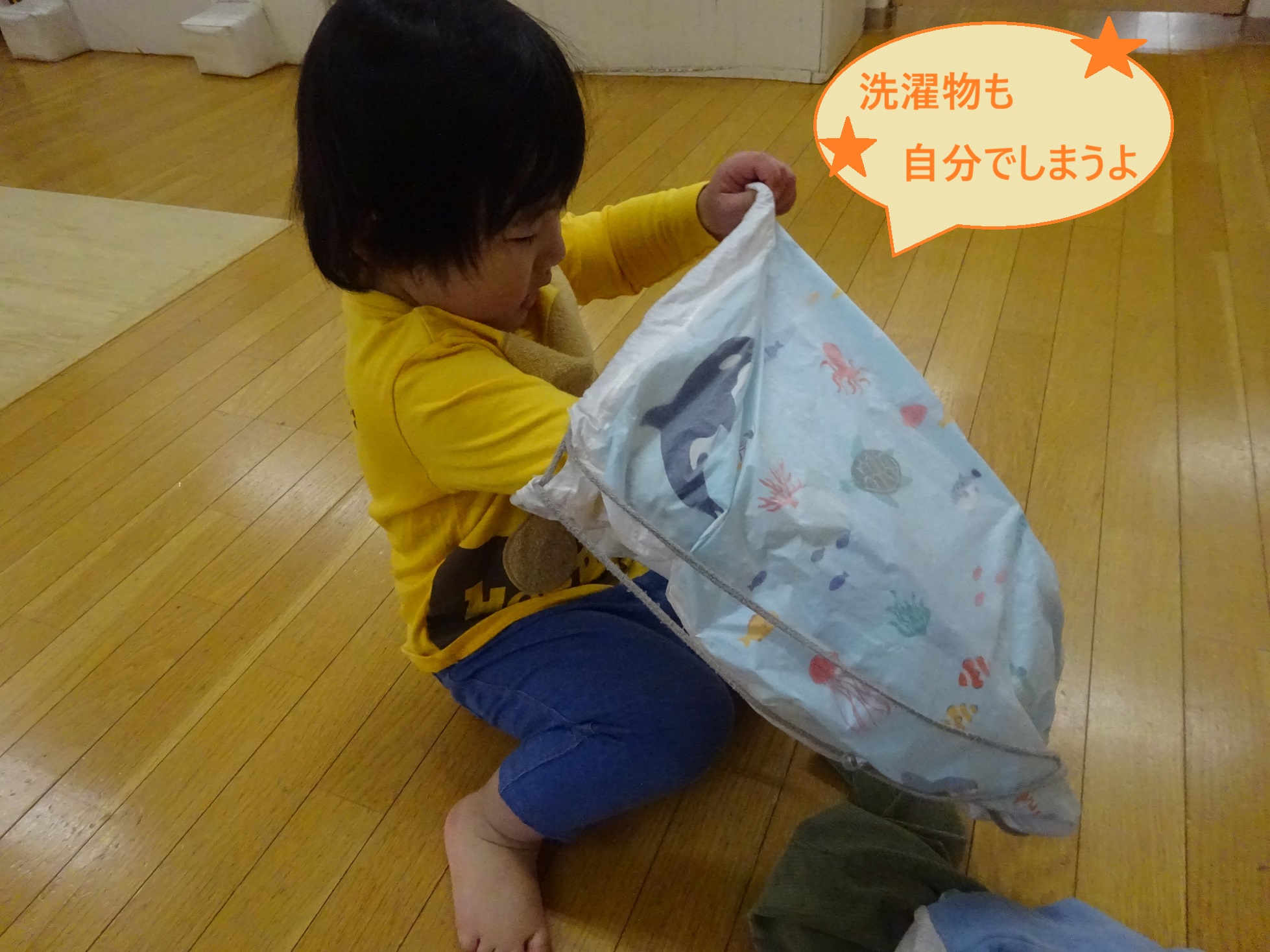 シリウス組(2歳児)は着替えをした後、洋服・肌着・ズボンをたたんで袋にしまいます。
