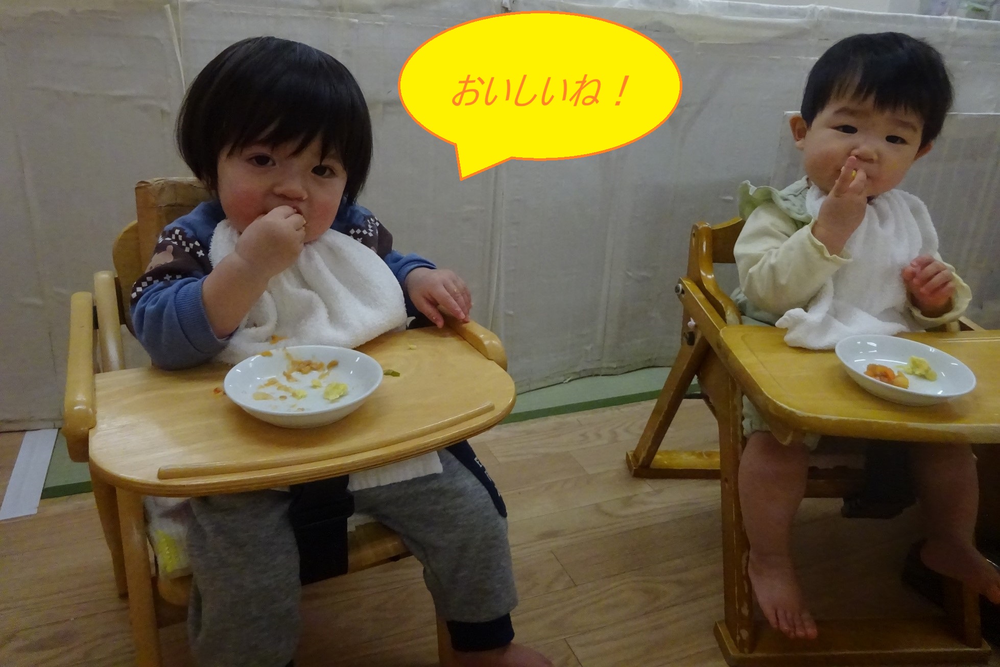 食べ物にも興味を持ち、手づかみで食べたりゆったりとした雰囲気の中、保育者と食事をすすめます。