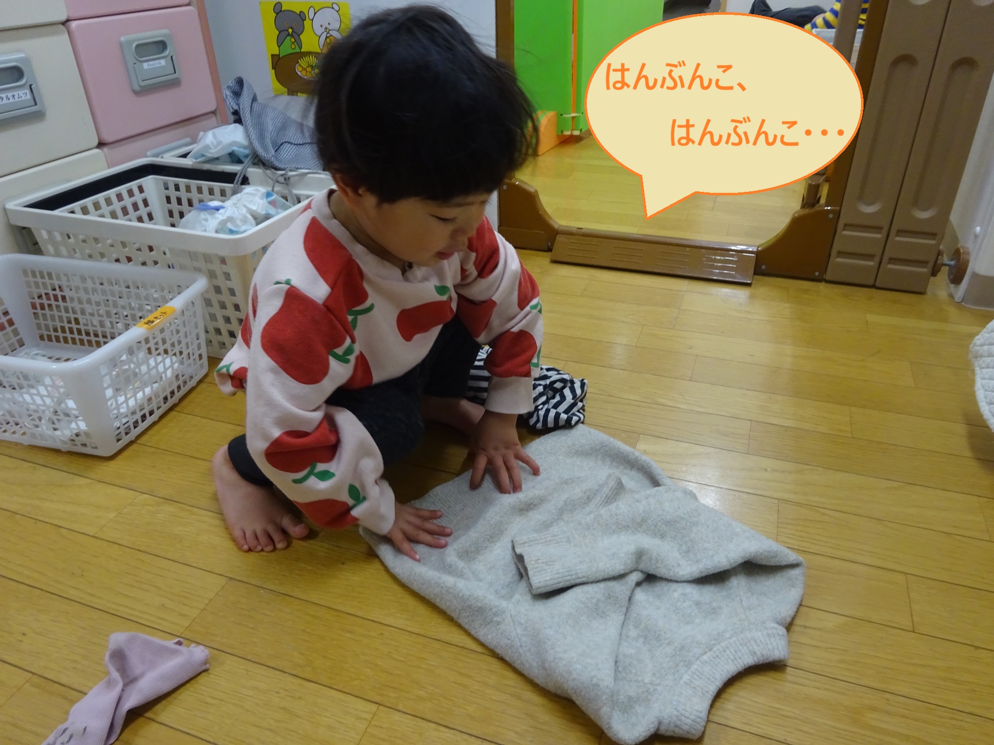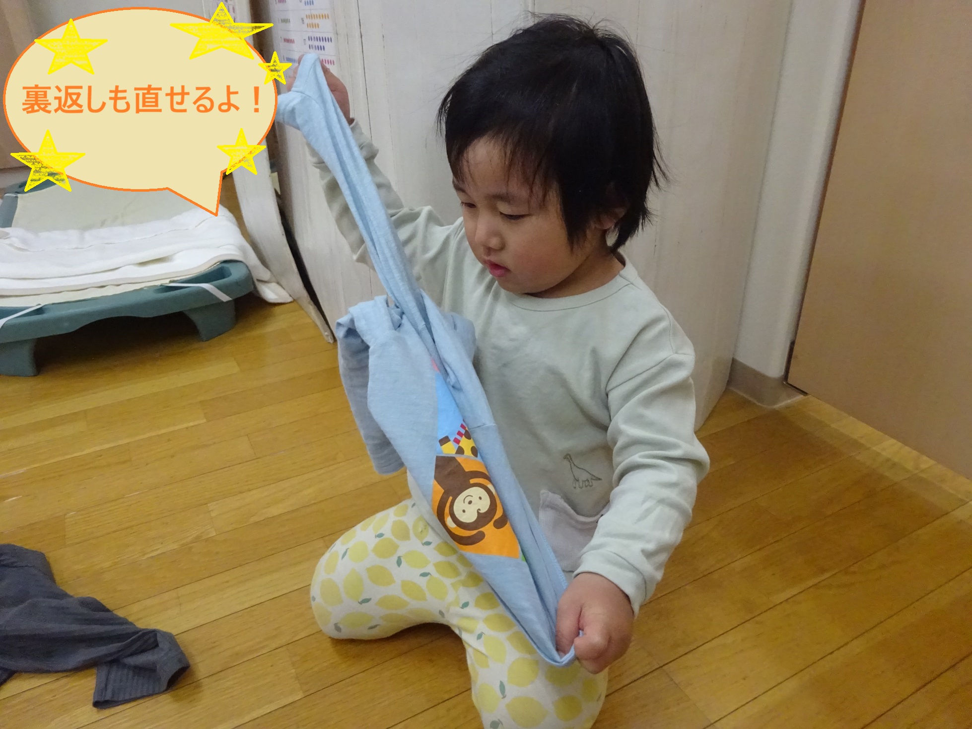 はじめは裏返しになった服をなおすのに苦戦したり、うまくたためなかったりしましたが、毎日繰り返すことで少しずつできるようになりました✨