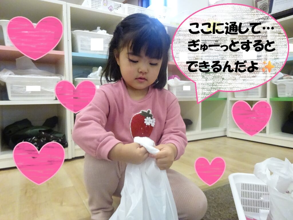 袋を結ぶことは少し難しいですが、先生と一緒に取り組んでいくなかで、やり方を吸収しています!