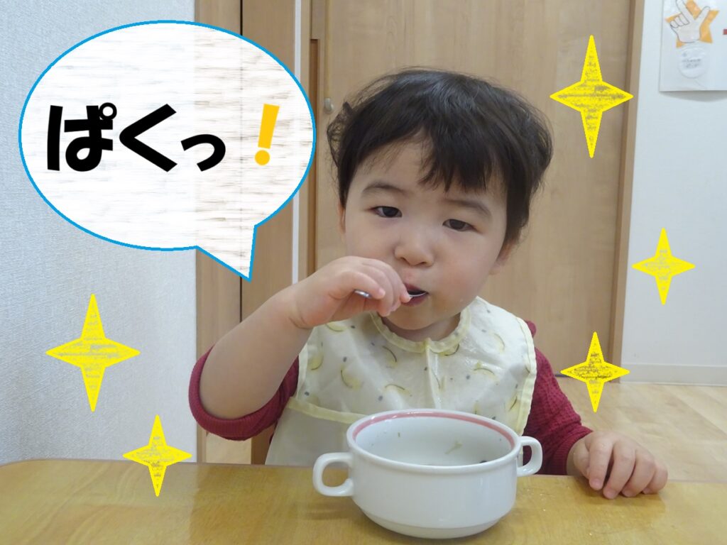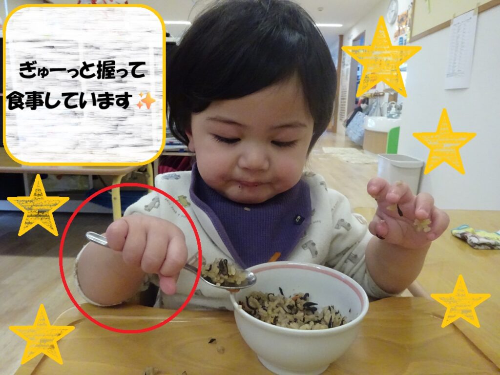 自分で食材をすくったり口に運ぼうとしたり、難しい時には先生と一緒にスプーンに食材を乗せたりしながら、意欲的に食事の時間を楽しんでいますよ🍴