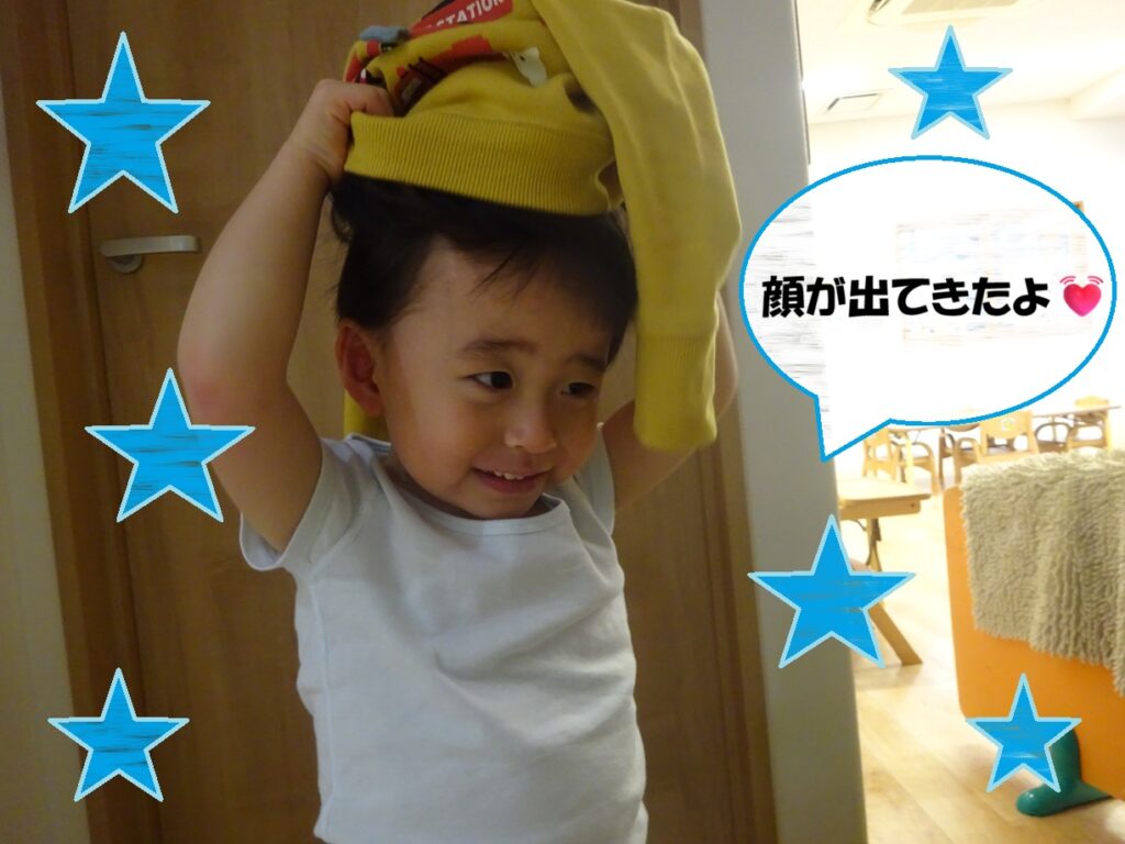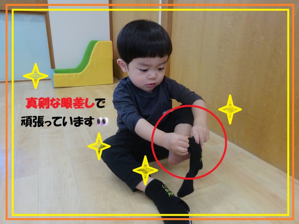 自分でやりたい気持ちの反面、思うように自分でできず苦戦する姿もありますがさりげなく援助しながら着脱の仕方を伝えていますよ🎶