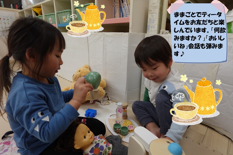 また、簡単な言葉や身振りで自分の思いを伝えようとしたり、お友だちの存在を意識して同じ遊びを楽しんだりする場面が多くなってきました。