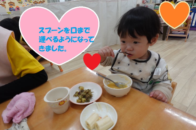 食事ではスプーンやコップに触れたり、自分でやってみようとする姿が増えてきました。次のクラスへ向かうための、心と体の基礎をじっくりと育んでいます🥰
