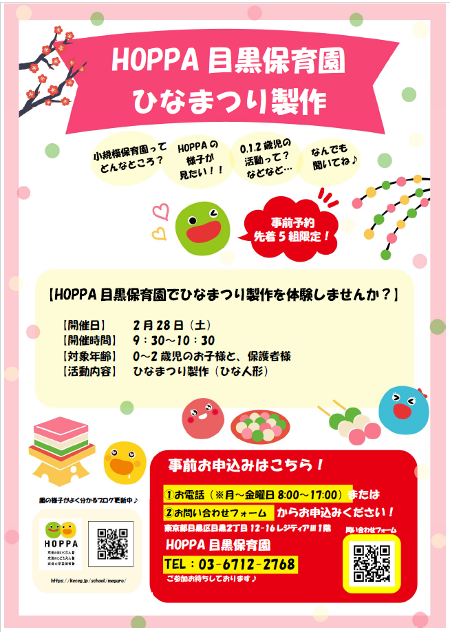 【東京都目黒区イベント情報】ひなまつり製作を楽しもう!【HOPPA目黒保育園】