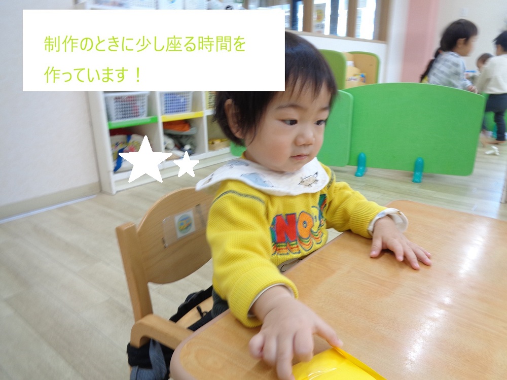 デネブクラス(0歳児クラス)は進級に向けて「1歳児が使っているものに興味を持つ」をねらいに、少しずつ1,2歳児用の椅子に座る練習をしています!
