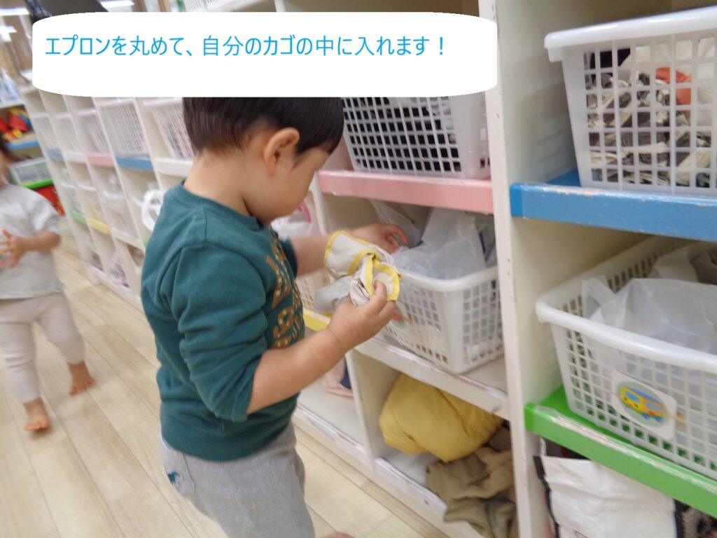 スピカクラス(1歳児クラス)は進級に向けて「身の回りのことを自分でする」を目標に、自分で使ったエプロンや衣服の片付けの練習をしています♪