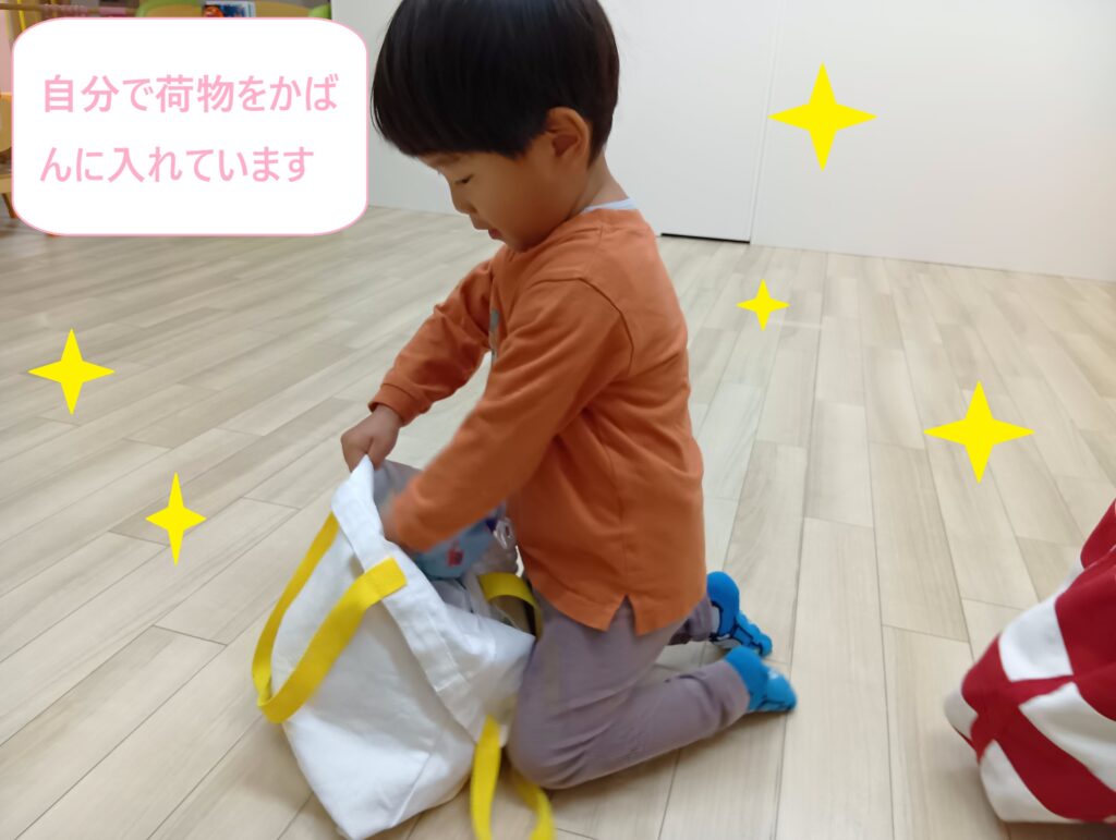 「どうやったらかばんに荷物が入るかな」と考え、一個ずつ入れてみたり、カバンの口を大きく広げてみたりと試行錯誤しながら、かばんに荷物をつめています。