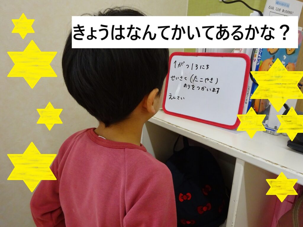 朝の会で活動内容を伝え掲示しておき、‘次は制作やからスモックを着よう’‘園庭に行くからトイレに行っておこう’と保育士が伝える前に自分で考えられるように取り組んでいます。